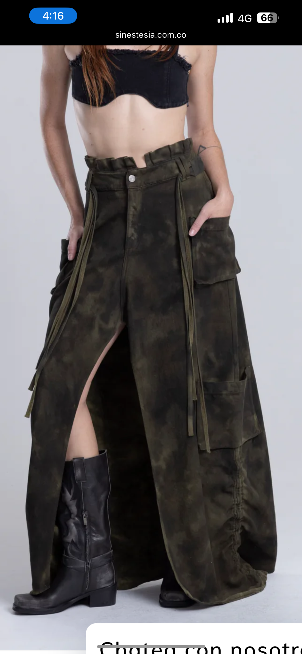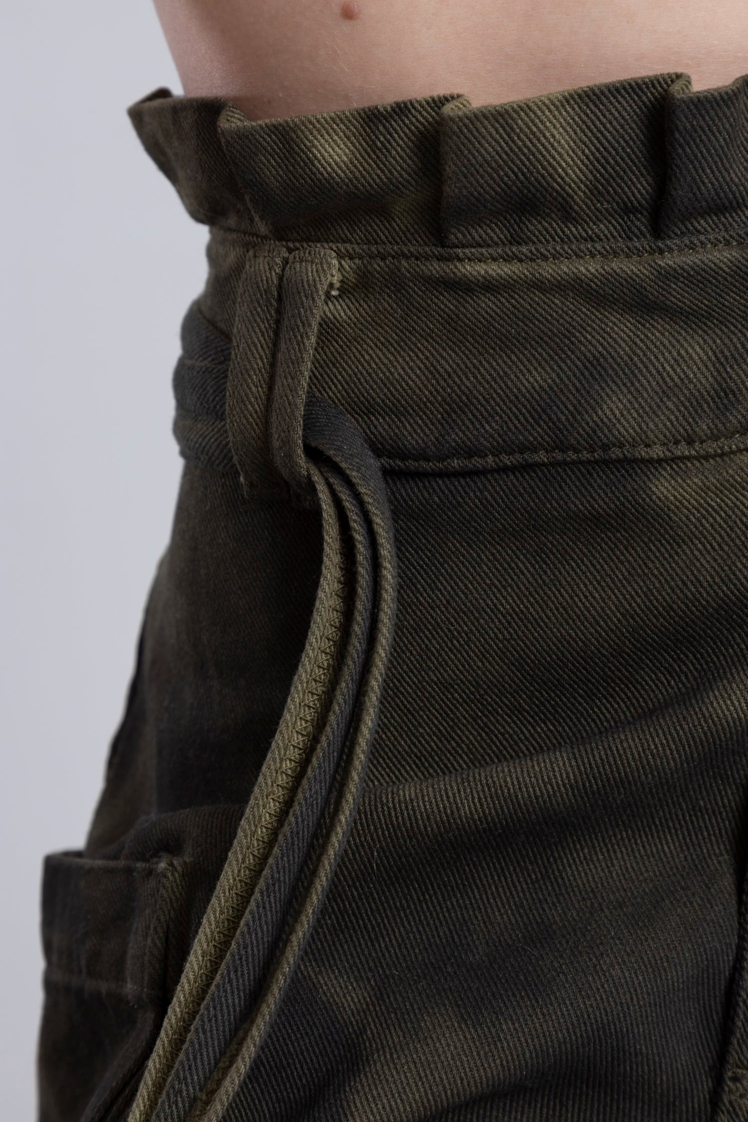 En los laterales, dos canales con elástico y tancas permiten ajustar y generar un fit medio bombacho o más recogido, transformando la caída según cómo quieras llevarla. Se complementa con un cinturón con cordones para marcar la cintura y equilibrar volúmenes.