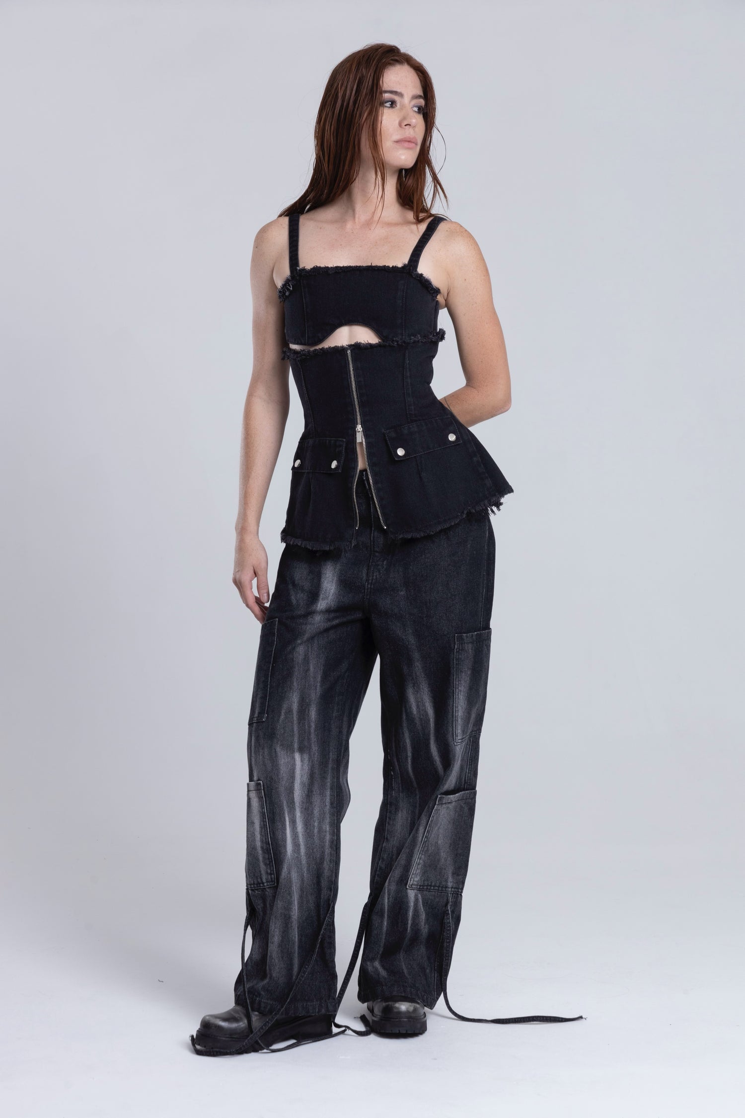 Un cargo unisex en denim negro raw, construido desde la estructura pero intervenido a mano con un amarre que dibuja la forma de una llama en la bota. Cada marca, cada contraste, es el rastro de algo que quiso quemar desde adentro.