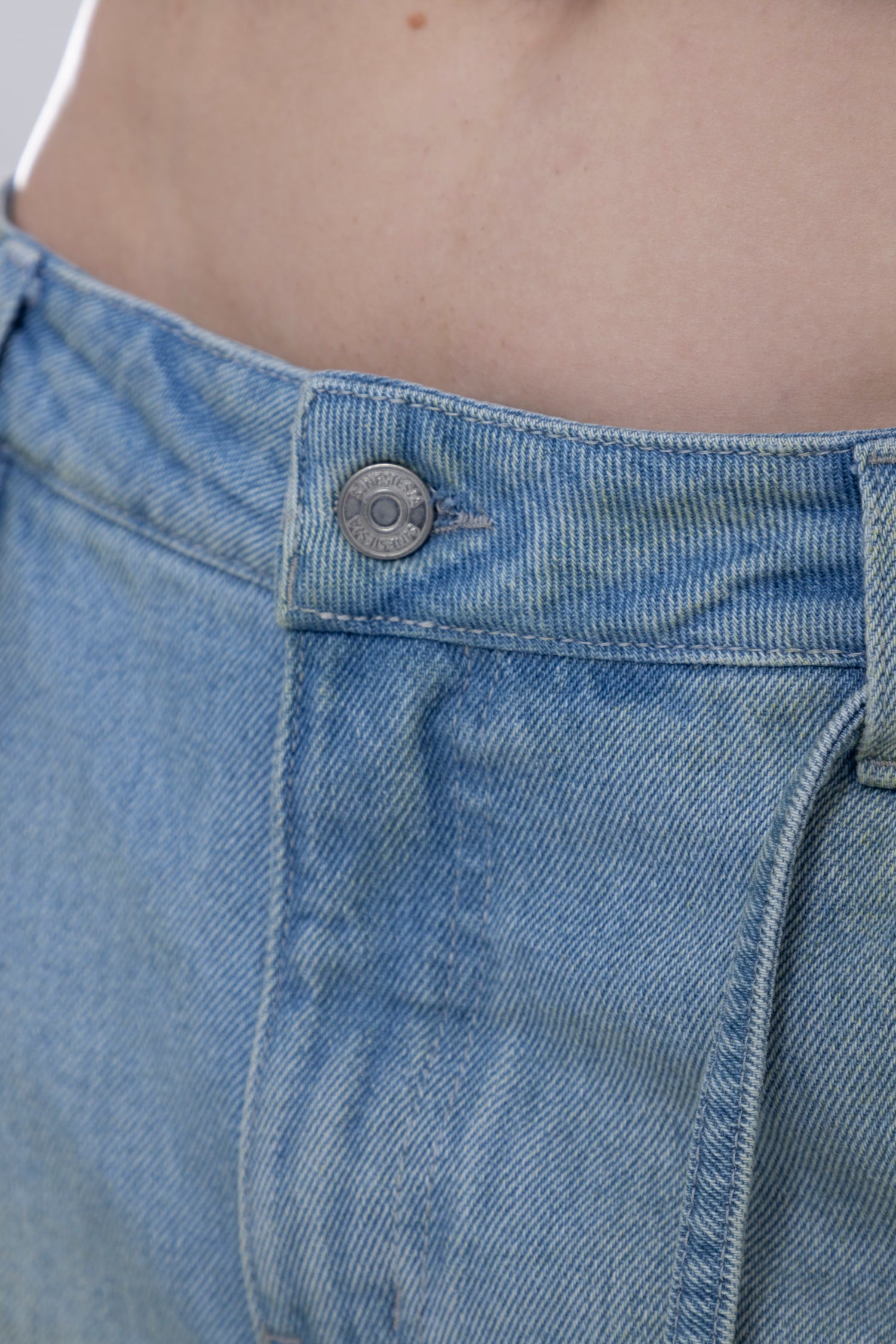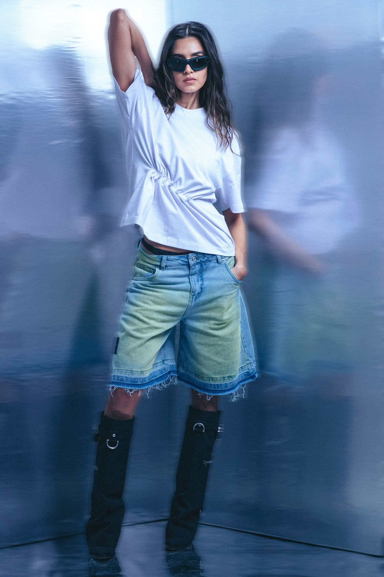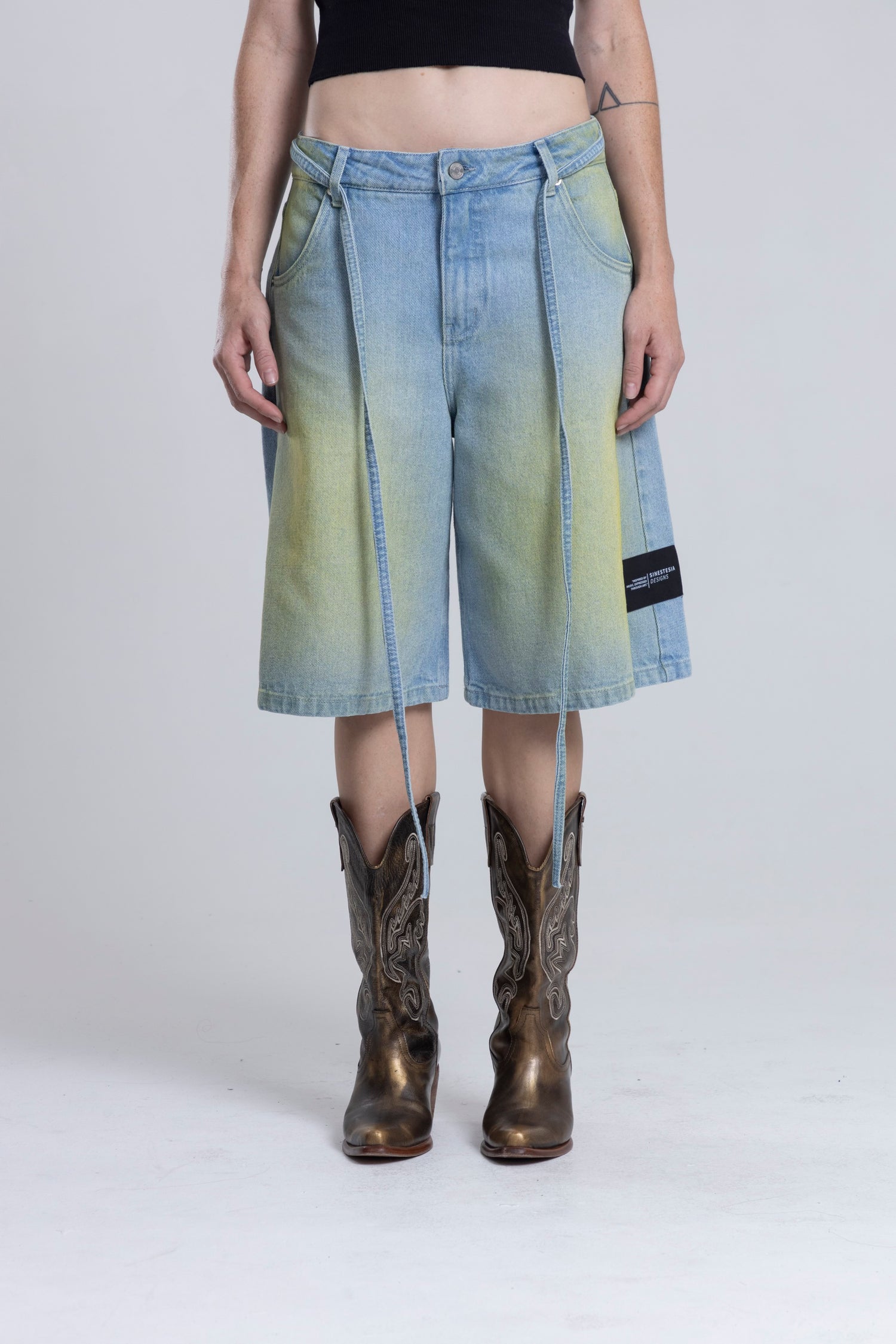 Nuestros Vibración Jorts están hechos en denim claro 100% algodón, con un lavado en tono lima difuminado que crea un efecto degradado único, como una sombra de luz moviéndose sobre la tela.