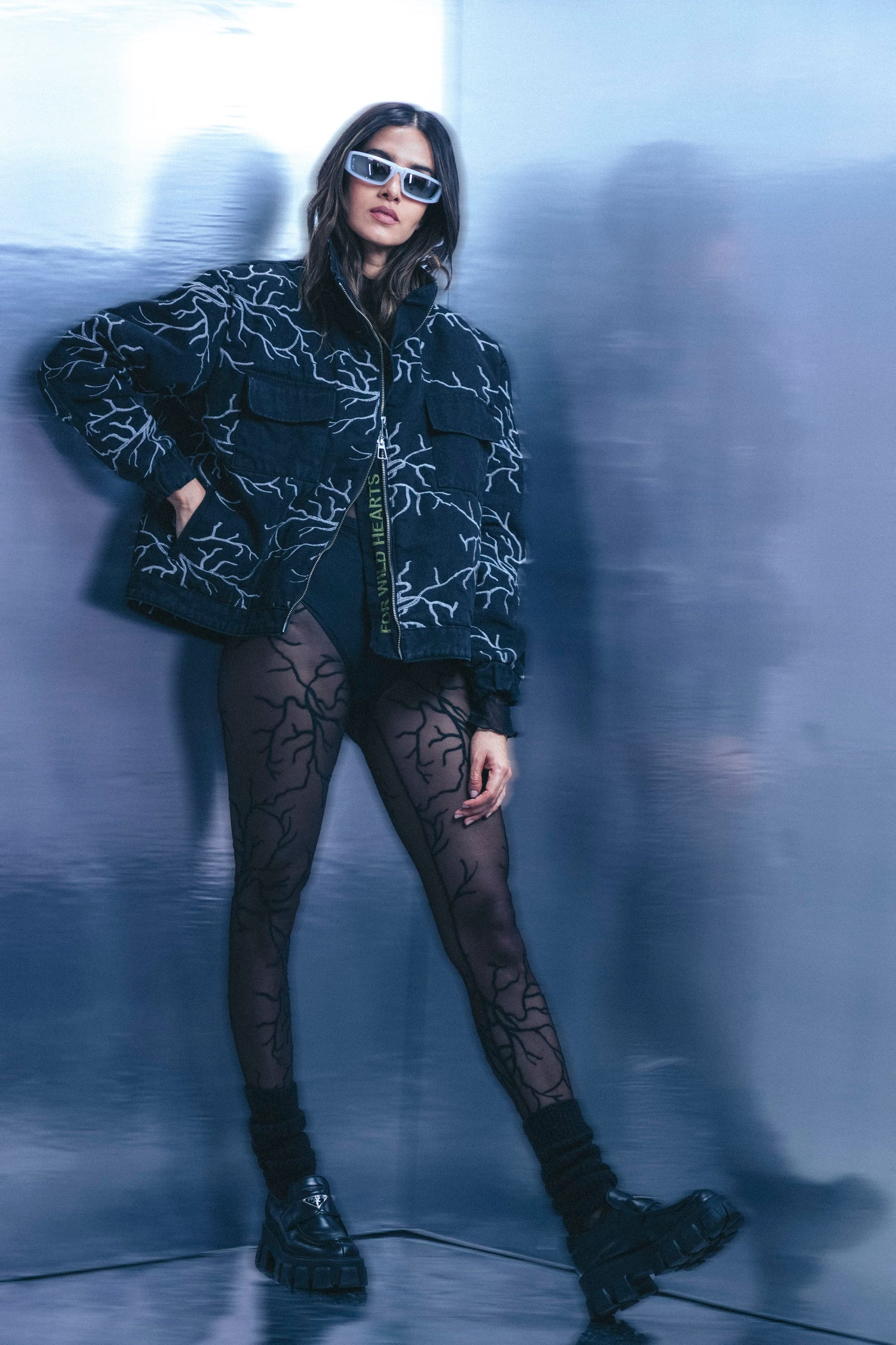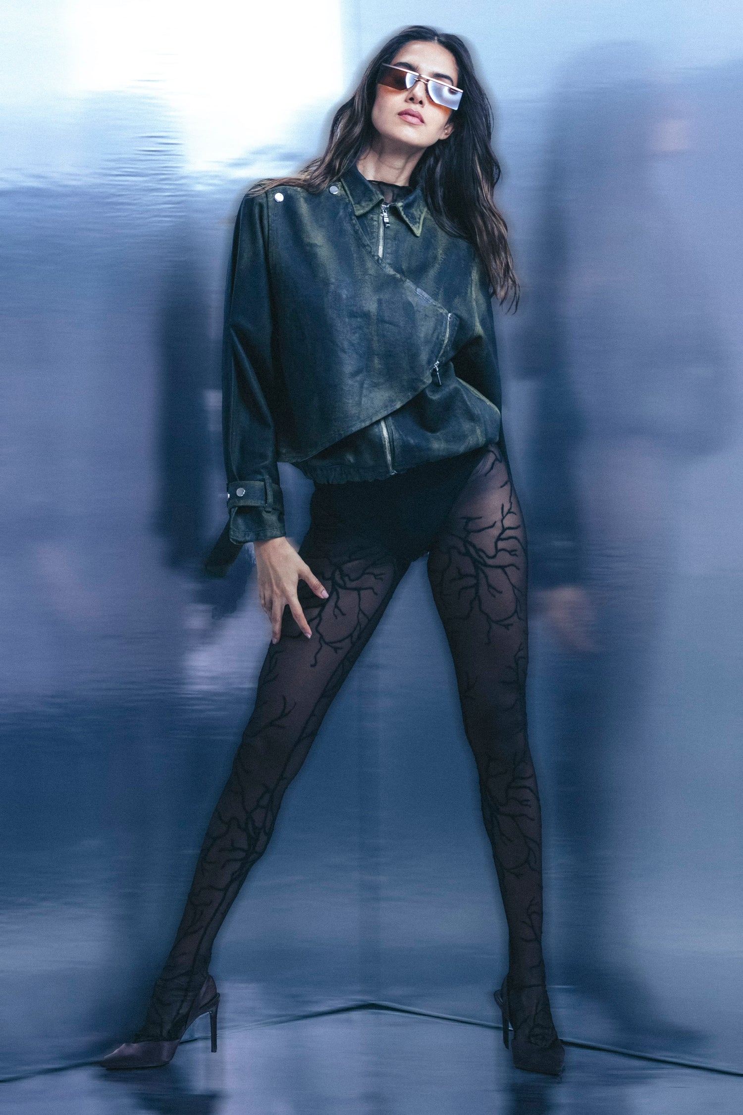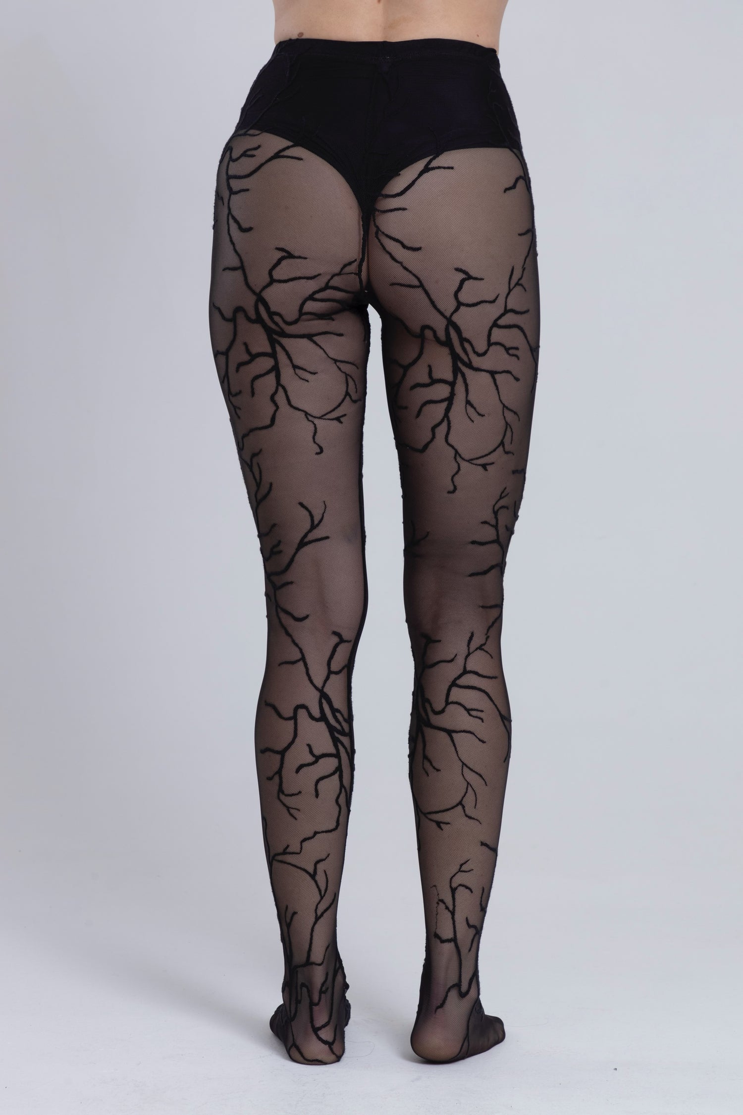 Confeccionadas en malla negra fina, llevan el bordado de arterias diseñadas a mano—el mismo motivo del Pulso Body y Pulso Dress—recorriendo la pierna como una emoción que sube, baja y respira.