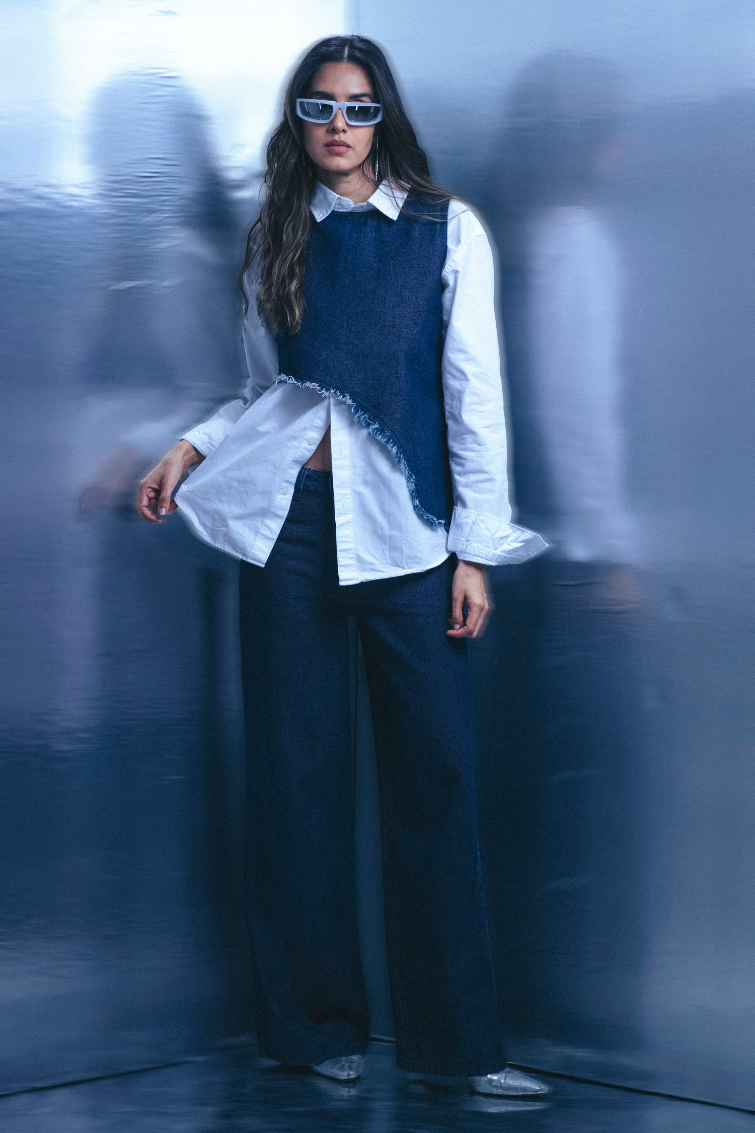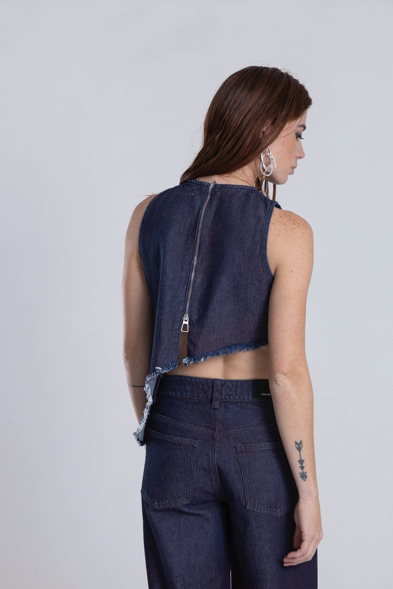 Su silueta es asimétrica, con ruedo desflecado que deja ver la crudeza del denim. En la espalda tiene un cierre separable, que puedes abrir por completo, mover al frente o usar como protagonista del look.