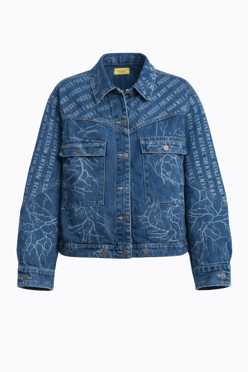 Chaqueta en denim tipo oversized unisex con print de las arterias del corazón y frase “ Statement pieces for wild hearts” que marcan la sutileza de lo salvaje.
