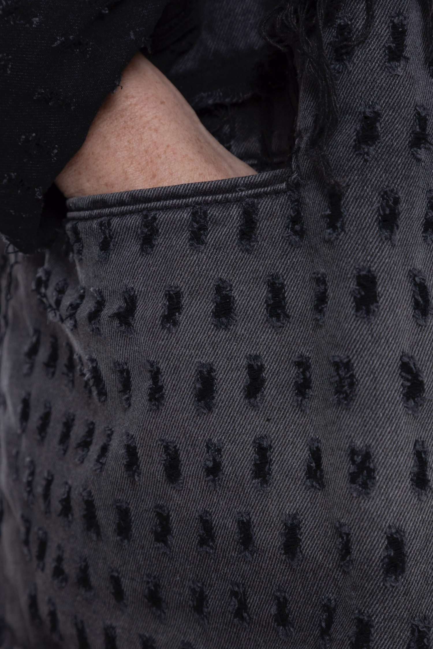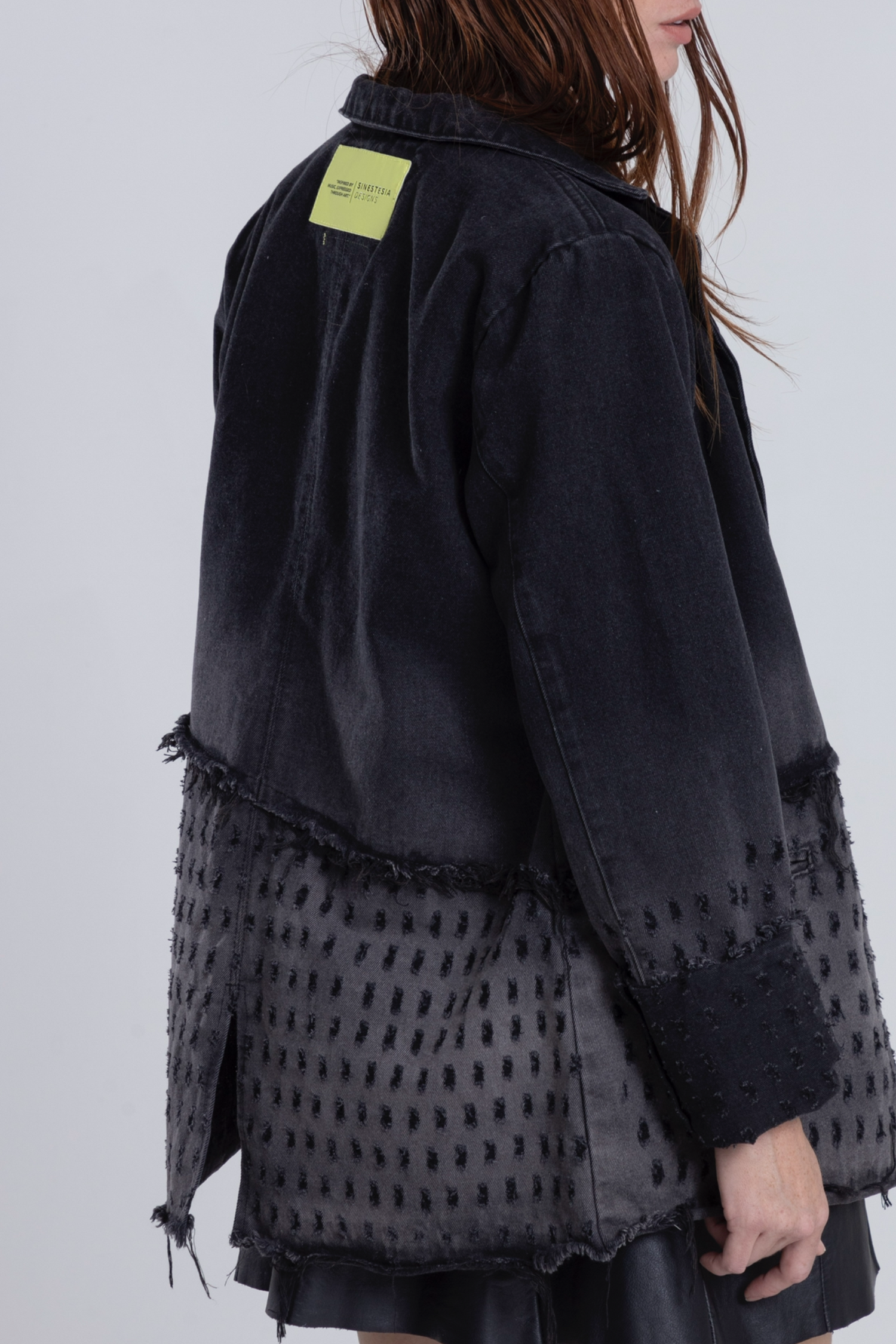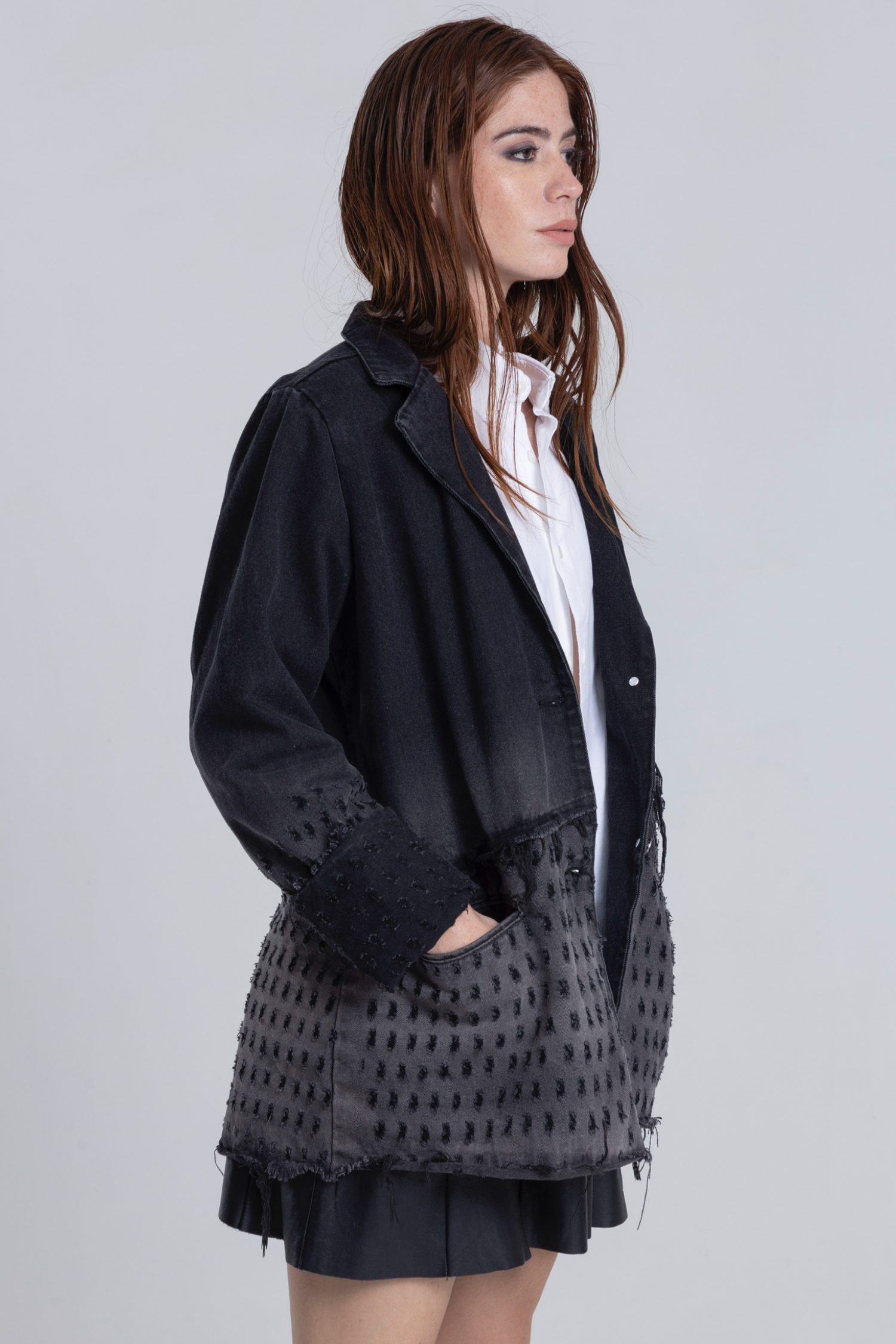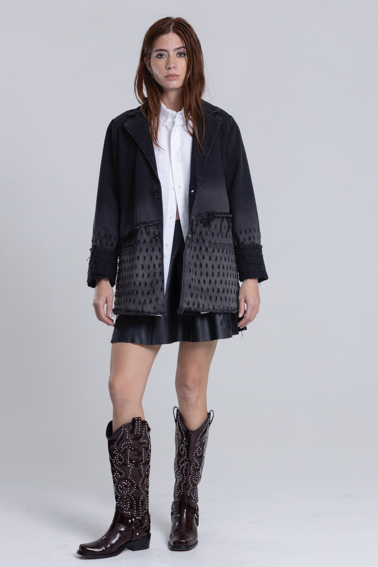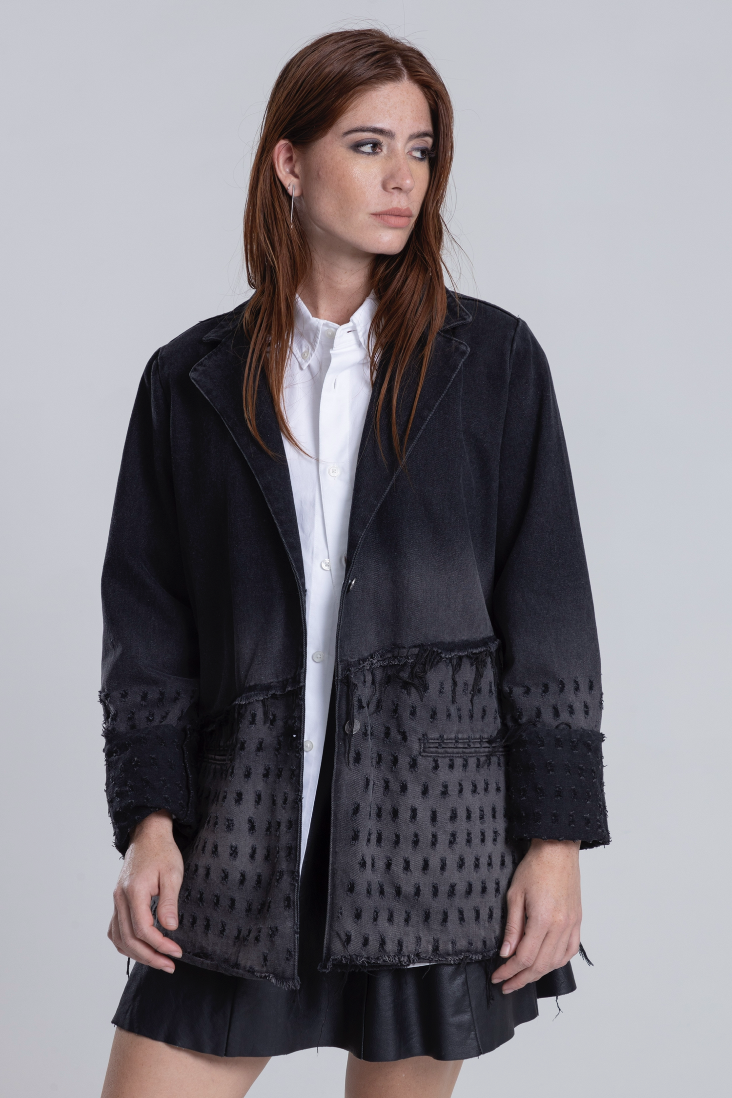 Blazer en denim negro con degradé y un corte en diagonal que destaca por su diseño único. Detalles desflecados y grabado láser en la parte inferior añaden un toque audaz. Cuenta con bolsillos frontales funcionales para complementar su estilo contemporáneo.
