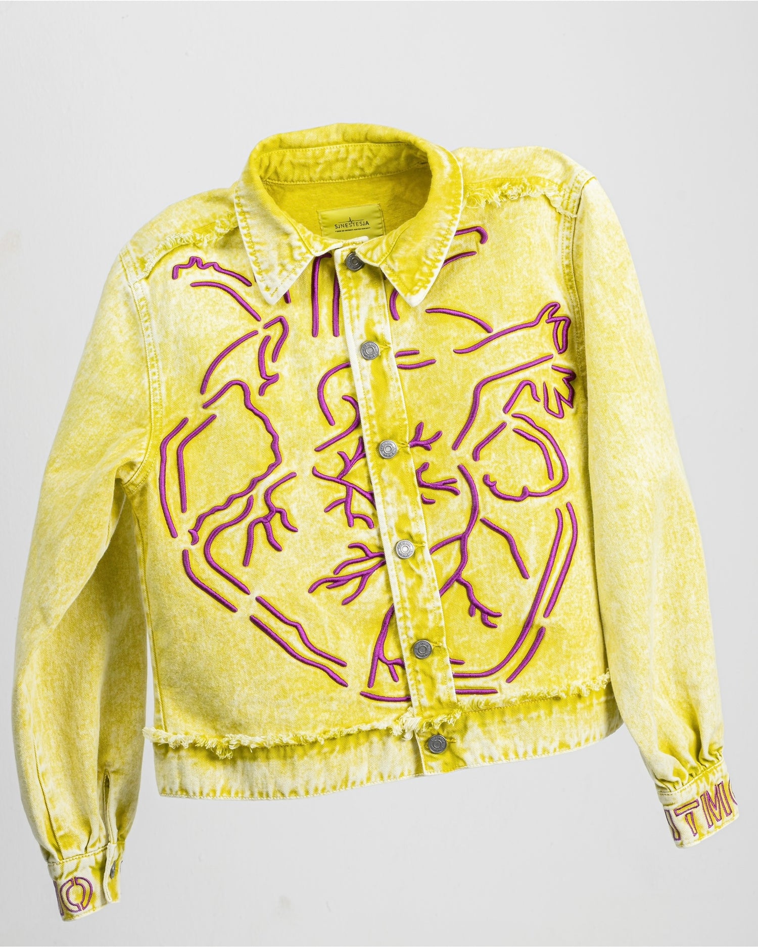 Esta chaqueta es todo un hit, sus colores llamativos, su corazón anatómico y su frase bordada “La razón al ritmo del Corazón” en espalda se llevará más de una mirada.