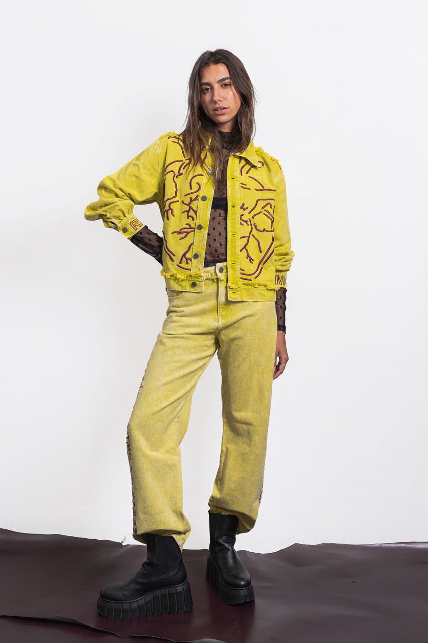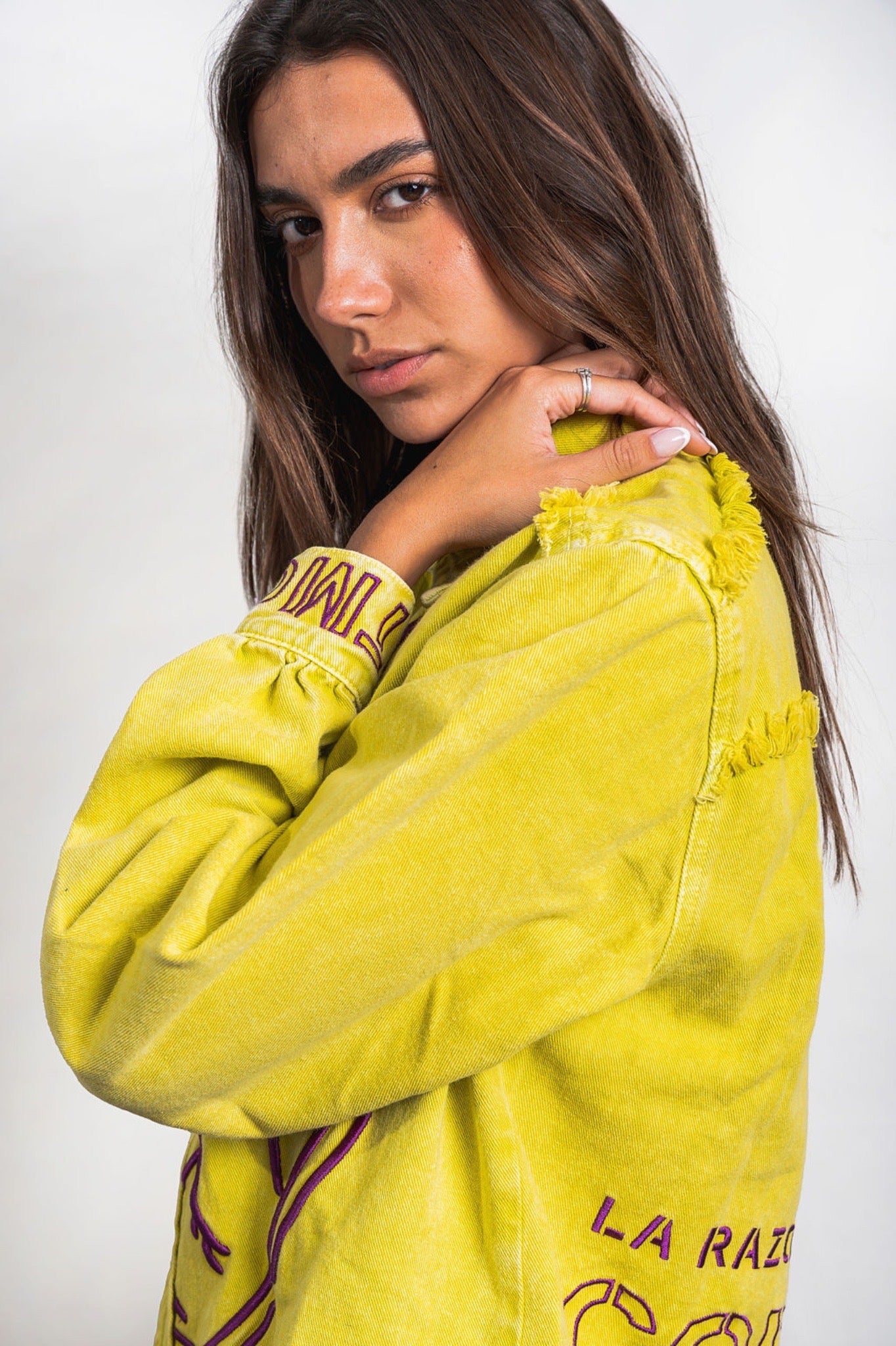 Chaqueta en drill en tono lima en acid wash, con mangas rectas y bordado en puños, frente y espalda.