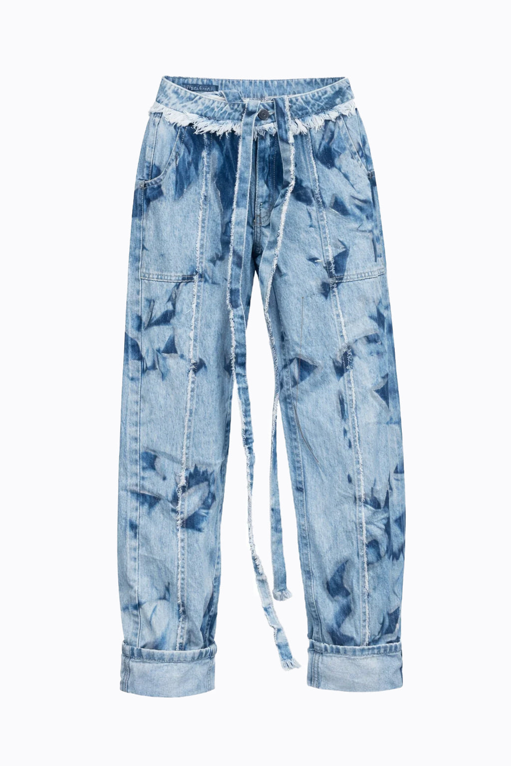 • Jean en denim claro con acabado tie dye en azul oscuro. Jean descaderado.